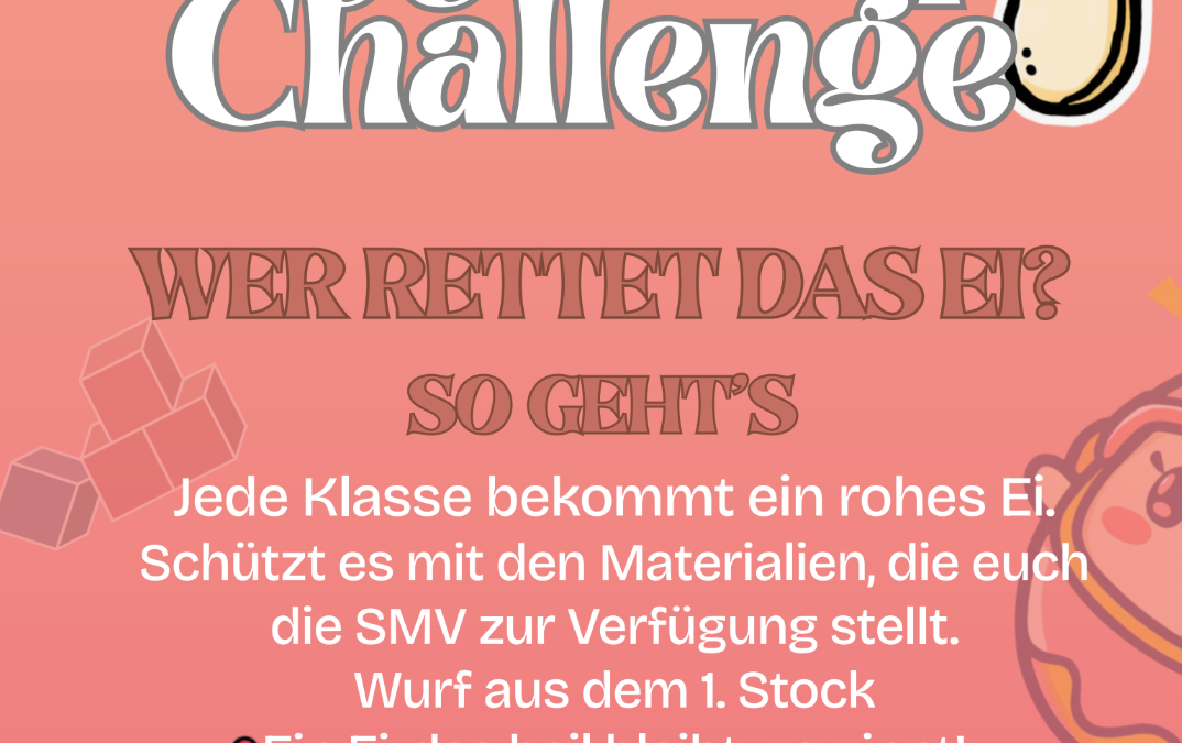 Vor den Osterferien wollte die SMV eine Osteraktion planen, die mit der Baustelle kompatibel ist. So wurde die Egg-Drop-Challenge geboren. Jede Mittelschulklasse bekam das gleiche Material (Luftballons, Strohhalme, Klopapier…) und hatte die Aufgabe, ein rohes Ei so zu verpacken, dass es den Sturz aus dem ersten Stock überlebt. Vielen Dank an Frau Stadter, dass sie ihr Klassenzimmer für diesen Spaß zur Verfügung gestellt hat.